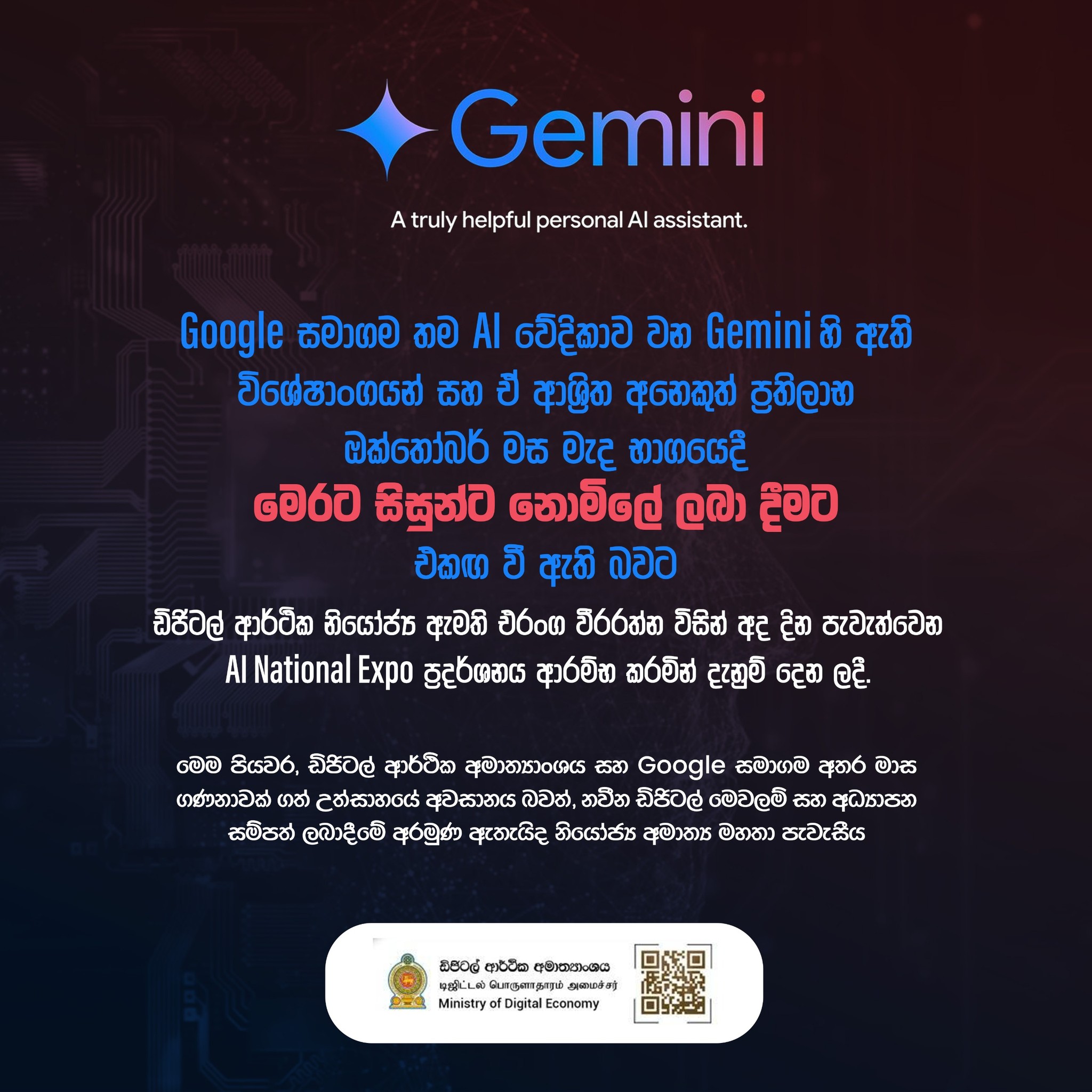 Google has agreed to provide the features of its AI platform, Gemini and other related benefits for free to students from mid-October, and the move is the culmination of months of efforts between the Digital Finance Ministry and Google Company, modern digital Honorable Deputy Minister of Digital Finance Eranga Weeraratne informed that this will be initiated with the purpose of providing tools and educational resources.